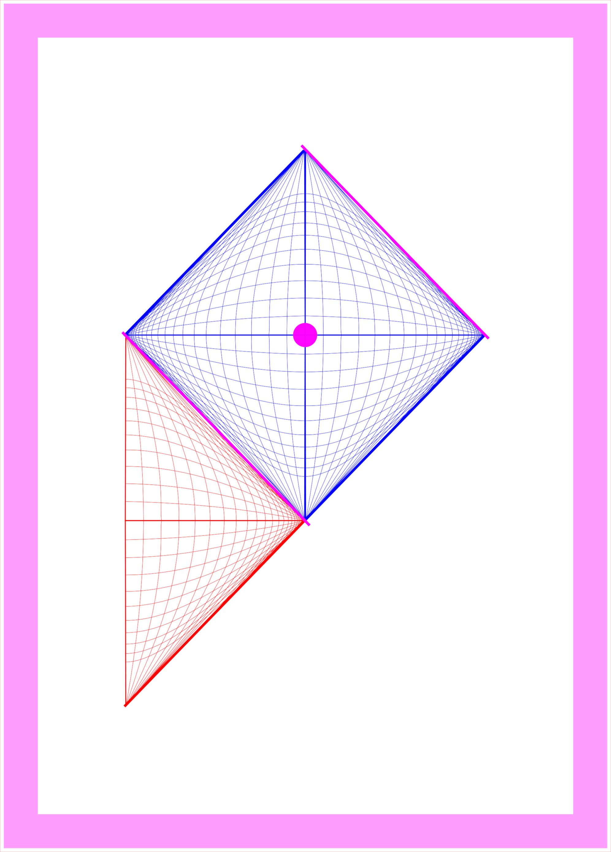 The first score is Rest Your Gaze, a piece that is realized at the moment the gaze rests on the magenta dot on the score. The blue grid represents space-time, our universe, and the red grid represents time-space, what is beyond an event horizon. The magenta dot in the middle of the blue grid represents the spatial and temporal locality of anybody who might look at the score, and it is the place where the score suggests resting your gaze.