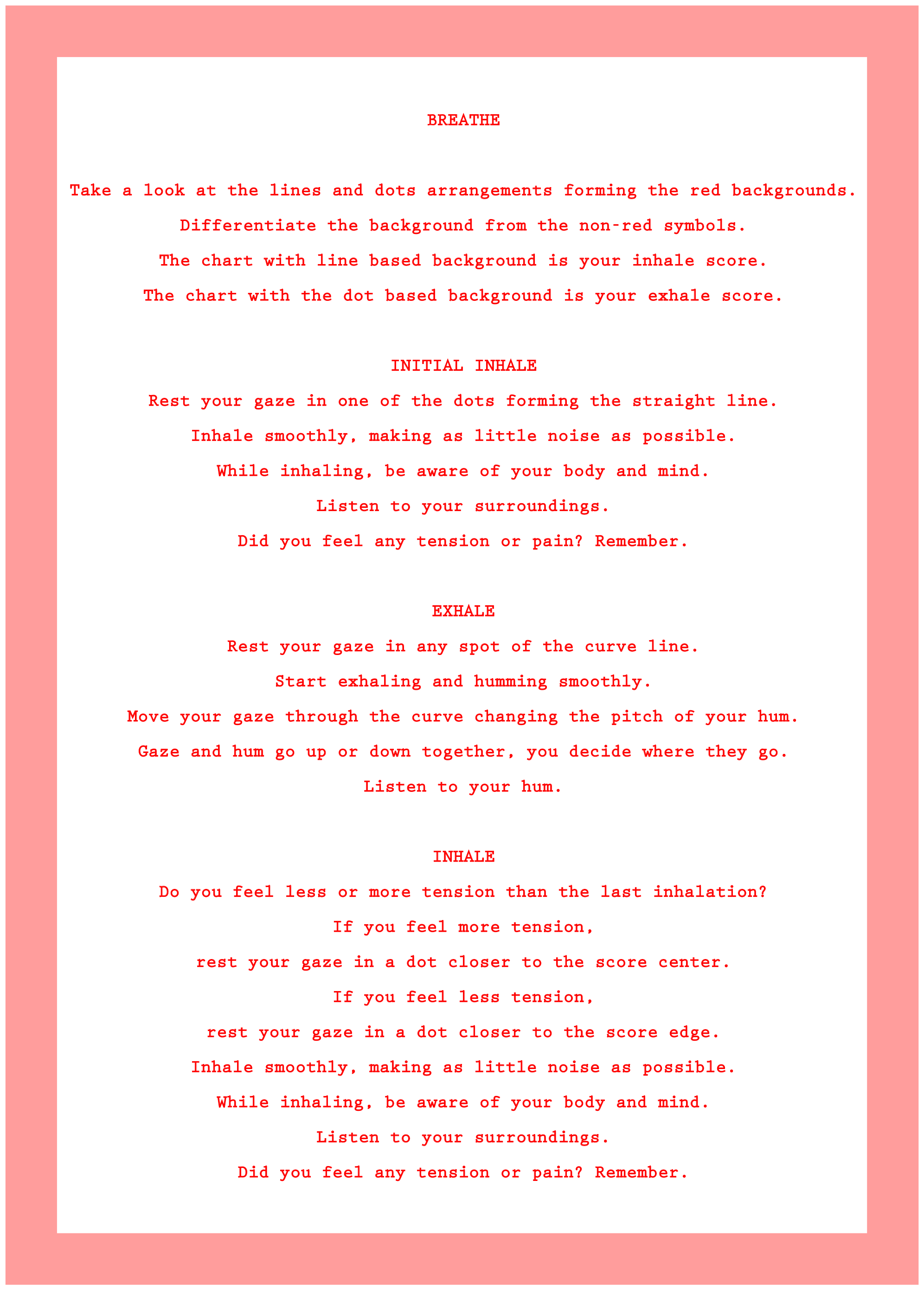 Breathe is a two-part Anti-cartesian gesture and score, graphically based on the smith chart, to be ideally performed after performing Rest Your Gaze. Each possible dot inside the charts represent a combination between a degree of resistance to a tension and a degree of resonance with a vibration. The dots and lines drawn on both charts are a suggestion on where to rest your gaze, not an instruction, and through the realization of the score performers might imagine and choose different points to rest their gaze.