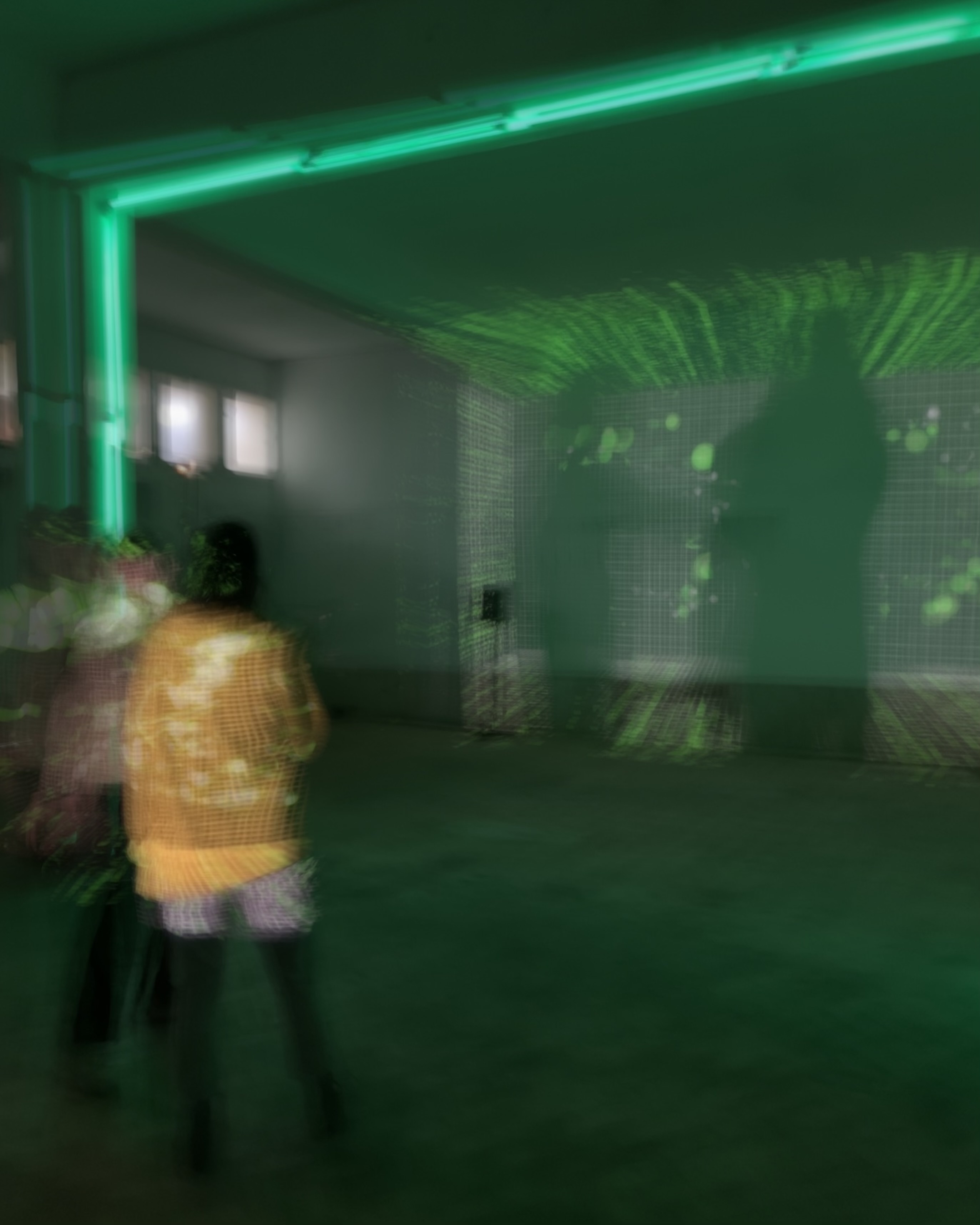 It is an interactive installation that explores our relation with space as a creative gesture by transducing human presence and simple pattern movements into a spatial audio-visual experience, transforming the space into a collective system with the possibility of self-organization.